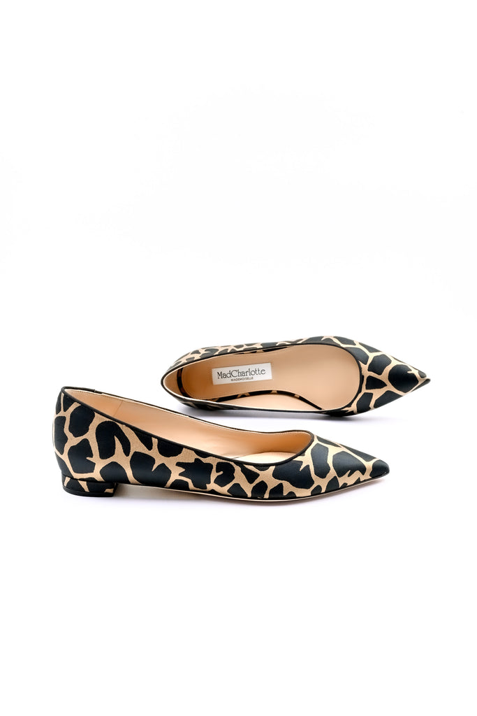 This striking ballerina is crafted from Italian jacquard satiné, woven in a playful giraffe motif that brings unexpected elegance to everyday dressing. With its soft leather insole and leather outsole, the Giraffe ballerina balances comfort with sophistication.