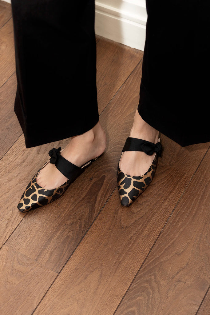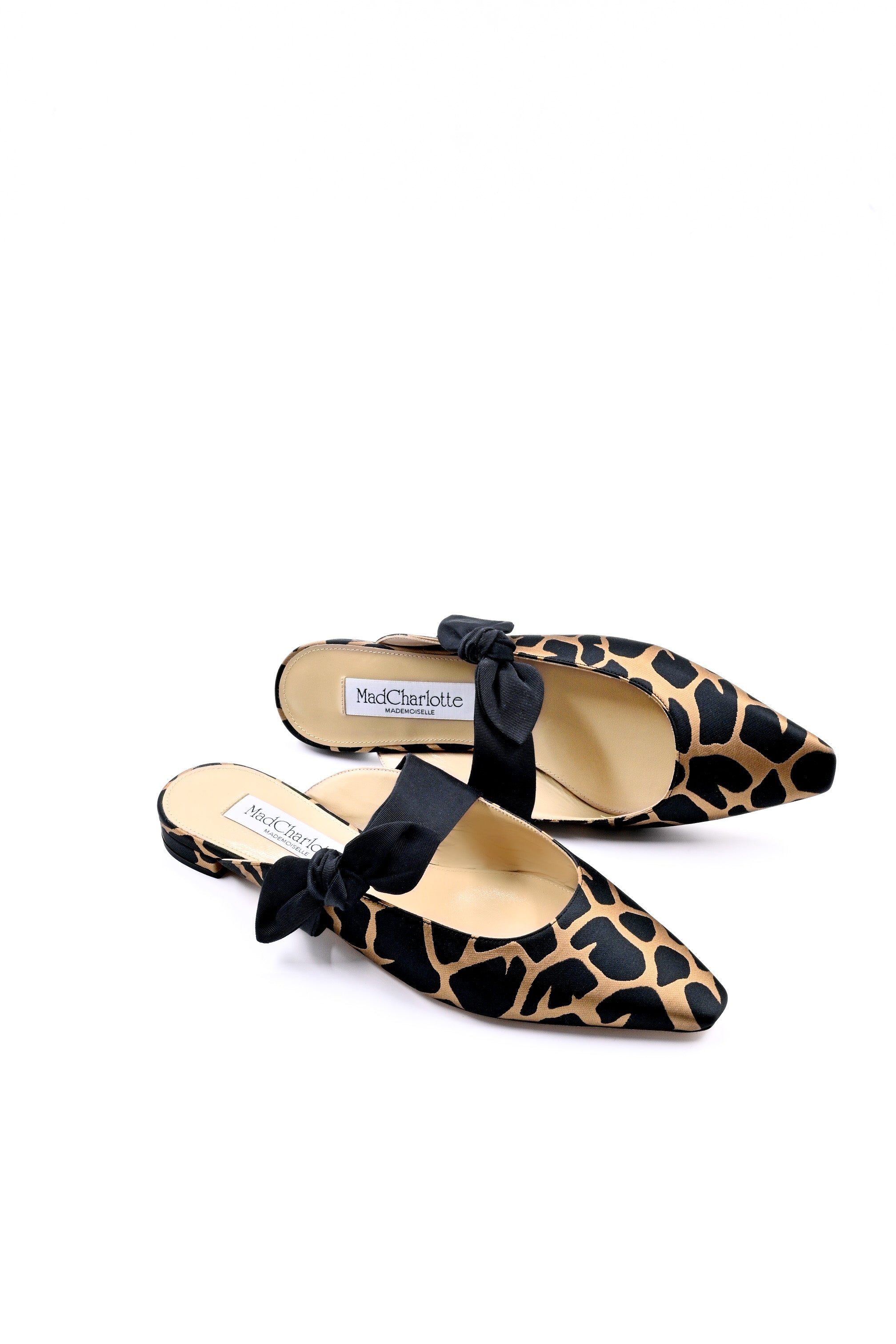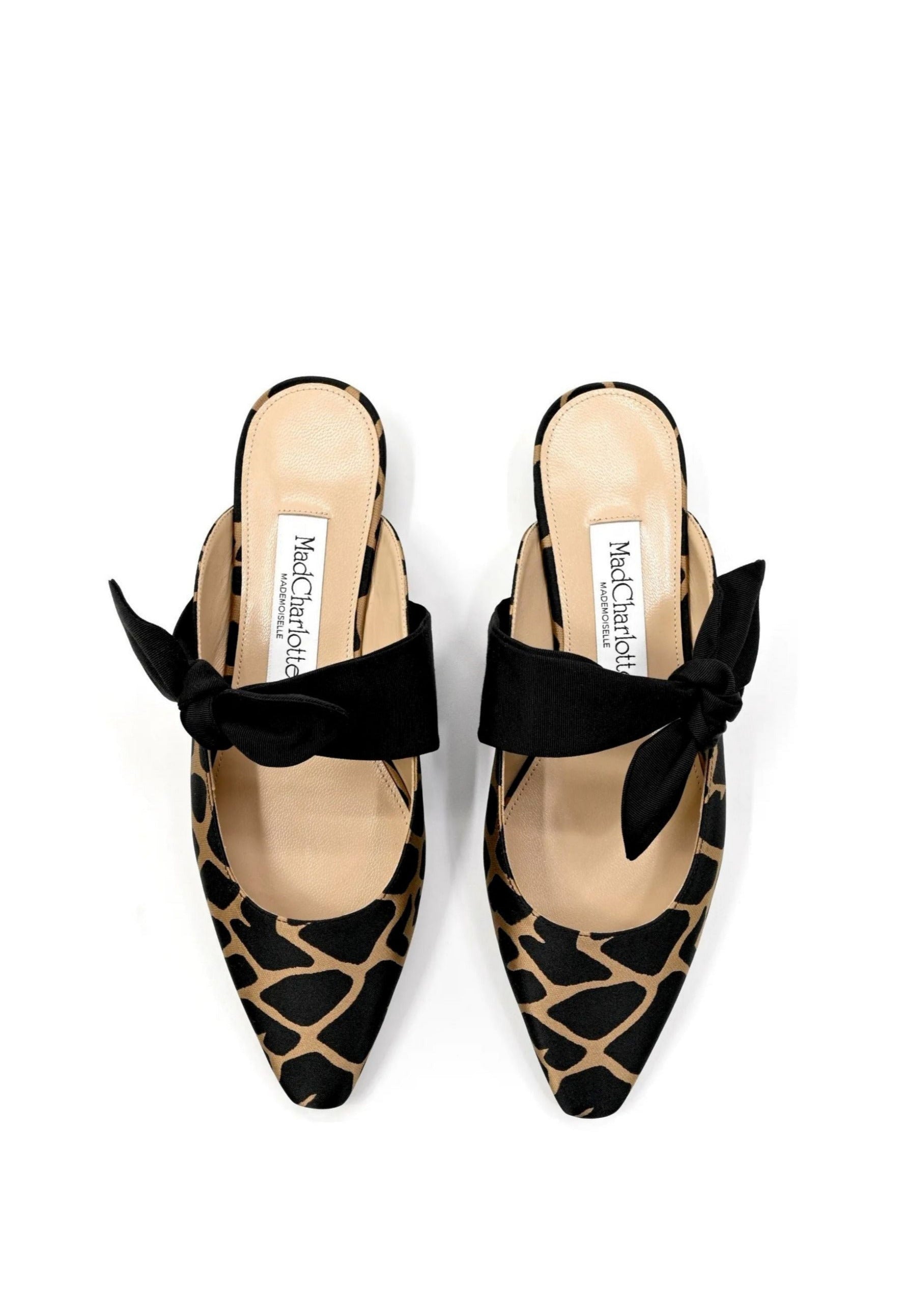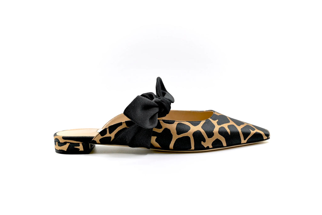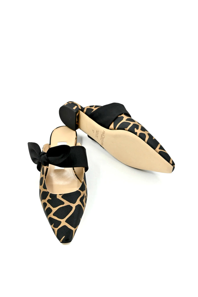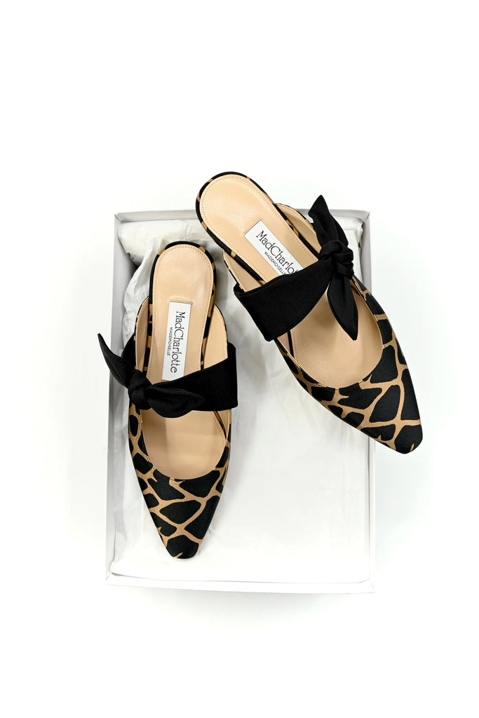 MadCharlotte's Gigi Mule is an art of playful sophistication. Crafted from Italian luxury materialis of richly woven giraffe-print jacquard and adorned with a gros grain bow that sits just off to the side for a touch of asymmetrical charm. The silhouette is finished with a manicured French tip, creating a flattering, elongating line. Perfect for elevating slim jeans in the daytime, pairing with tailored trousers for a refined look, or adding business-meets-pleasure allure to an impromptu dinner date.