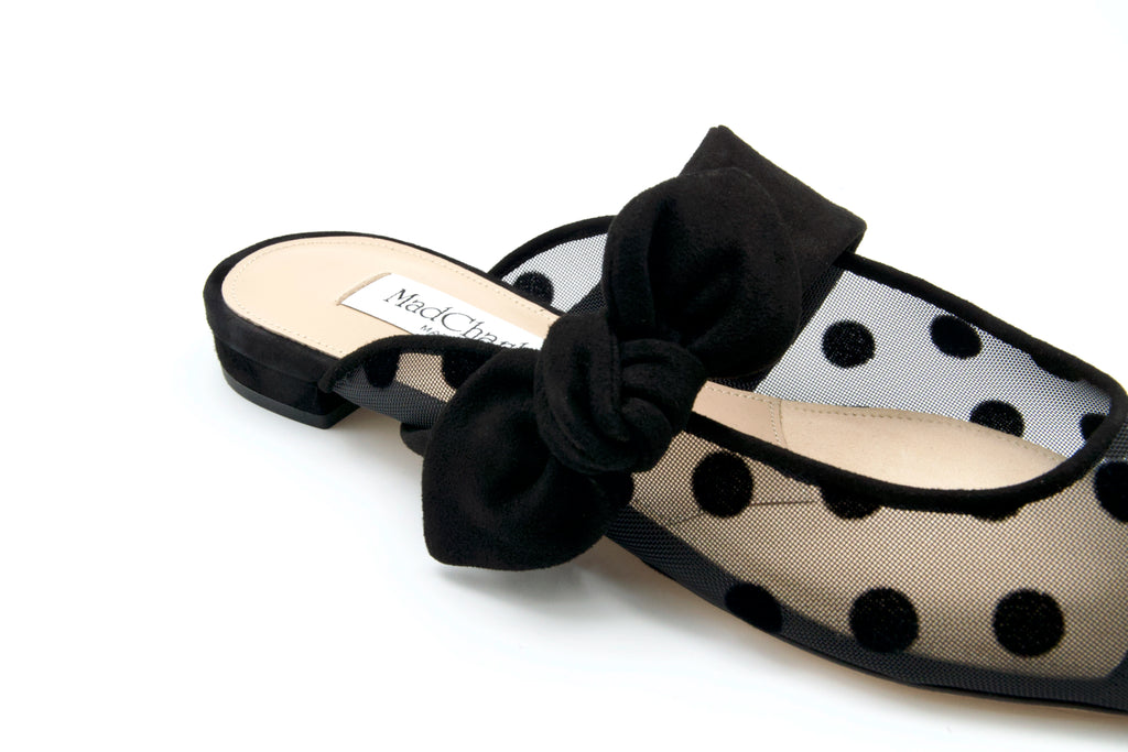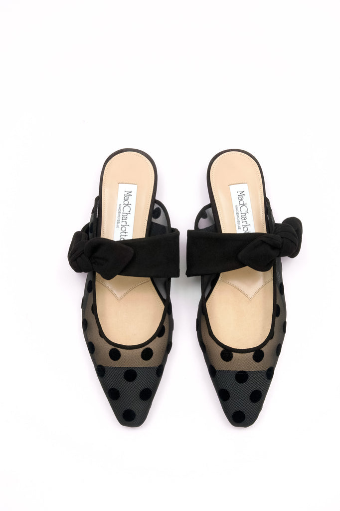 Feminine and playful, Gigi as La Tenue de Soirée embodies the elegance of Parisian nights. Crafted in sheer black mesh embroidered with velvet polka dots and finished with a soft suede bow, this backless mule evokes effortless allure. Designed for soirées, cocktail parties, or intimate home entertaining, it strikes the perfect balance between flirtation and refinement.