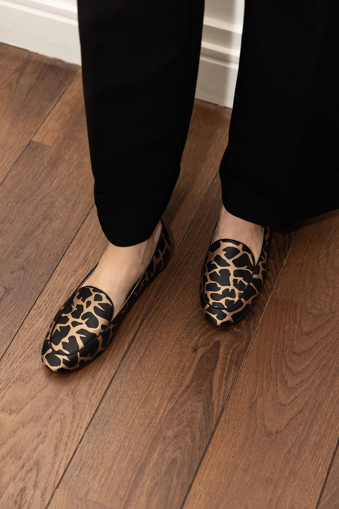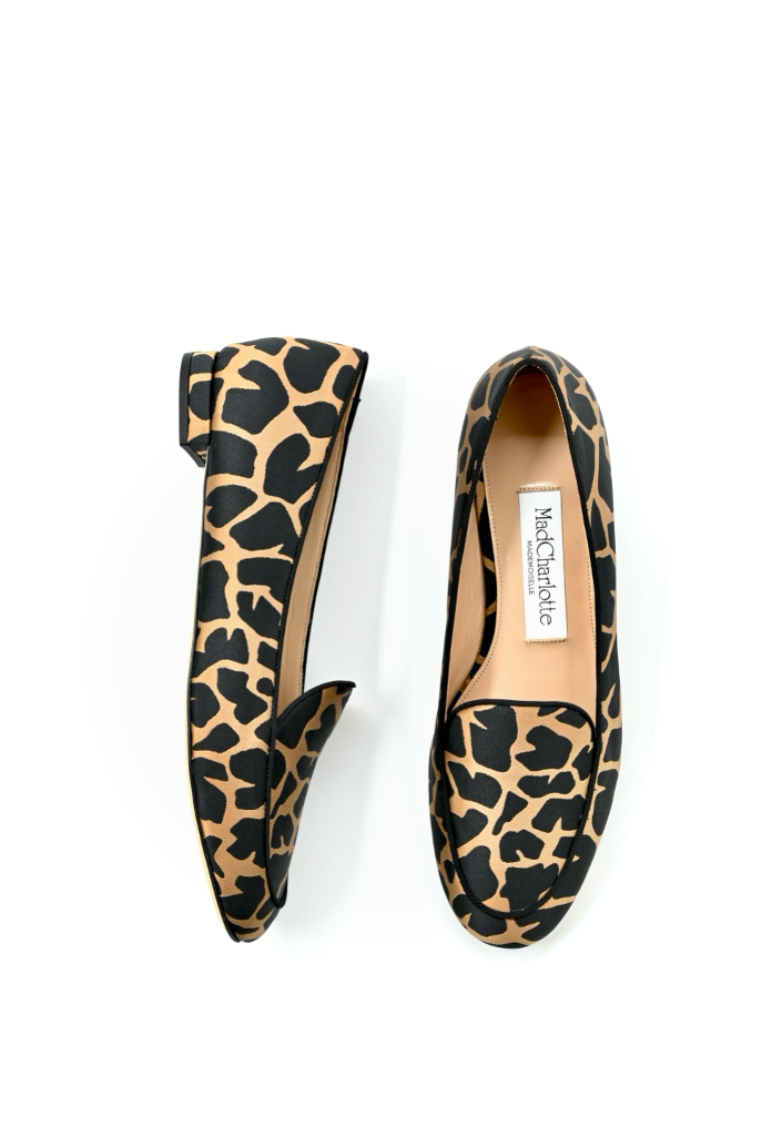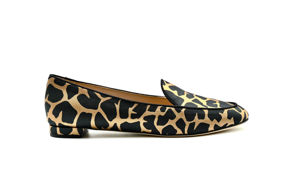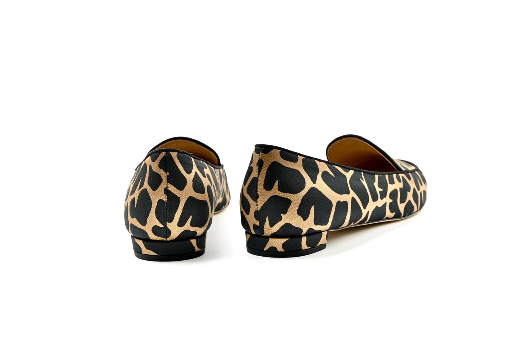 This striking loafer is crafted from Italian jacquard satiné, woven in a playful giraffe motif that brings unexpected elegance to everyday dressing. With its soft leather insole and leather outsole, the Giraffe Loafer balances comfort with sophistication — a slipper silhouette reimagined with attitude.